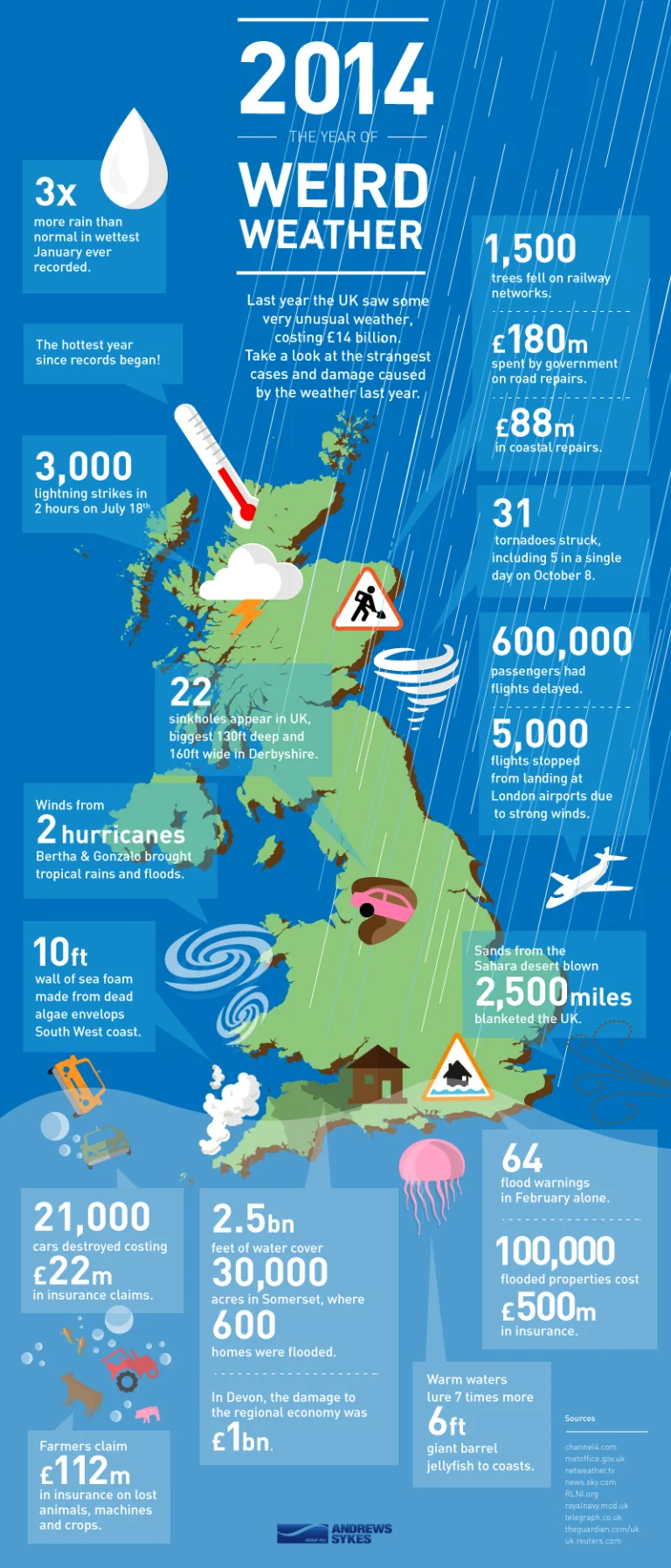 From crippling floods to record-breaking temperatures, 2014 was certainly one of the most bizarre years as far as British weather is concerned. At Andrews Sykes, we have designed the above infographic in a bid to document the more obscure statistics to have emerged over the past 12 months. Extreme weather affected virtually every part of the UK in one way or another – at a total of cost of £14 billion – so here’s hoping for a more predictable year as 2015 unfolds.