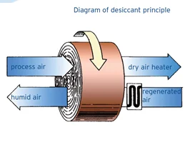Desiccant materials (such as silica gel) have a high affinity for absorbing water vapour. Today, most desiccant dehumidifiers use the desiccant material in a ’rotor’ form. Rotors are manufactured from alternate layers of flat and corrugated sheets impregnated with the active component (desiccant). This forms a vast number of axial air channels running parallel through the rotor structure. As air passes through these channels, moisture is transferred between the air and the desiccant.