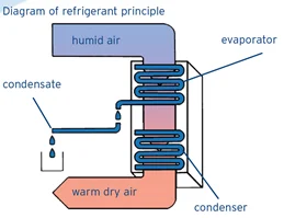 The way our refrigerant dehumidifier units work is similar to how condensation forms on a cold window. A refrigerant dehumidifier contains a compact refrigeration system which makes it the coldest place in the room. Air is drawn into the cold dehumidifier where any moisture in the air condenses on the hydrophilic coils and is collected into a container.